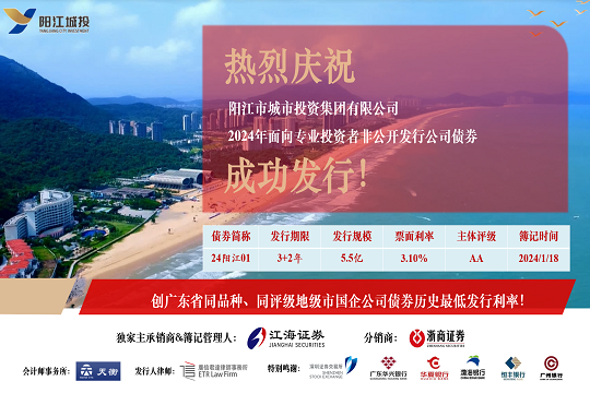 2024年1月19日,市城投集團在深圳證券交易所成功發(fā)行“陽江市城市投資集團有限公司2024年面向?qū)I(yè)投資者非公開發(fā)行公司債券”。本期債券發(fā)行規(guī)模為5.5億元,期限為5(3+2)年,票面利率3.10%,全場認(rèn)購倍數(shù)超過4.8倍,是...