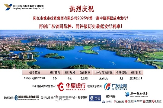 2025年1月15日,市城投集團在中國銀行間交易商協(xié)會成功發(fā)行“陽江市城市投資集團有限公司2025年第一期中期票據(jù)”。本期債券發(fā)行規(guī)模為6億元,期限為3年,票面利率2.15%,全場倍數(shù)超過3.1倍,合計申購機構(gòu)數(shù)23家。本期債...